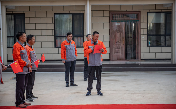 儀式第一項(xiàng)總經(jīng)理王慶偉同志為黨員佩戴黨徽,為入黨積極分子及員工分發(fā)紅旗;
